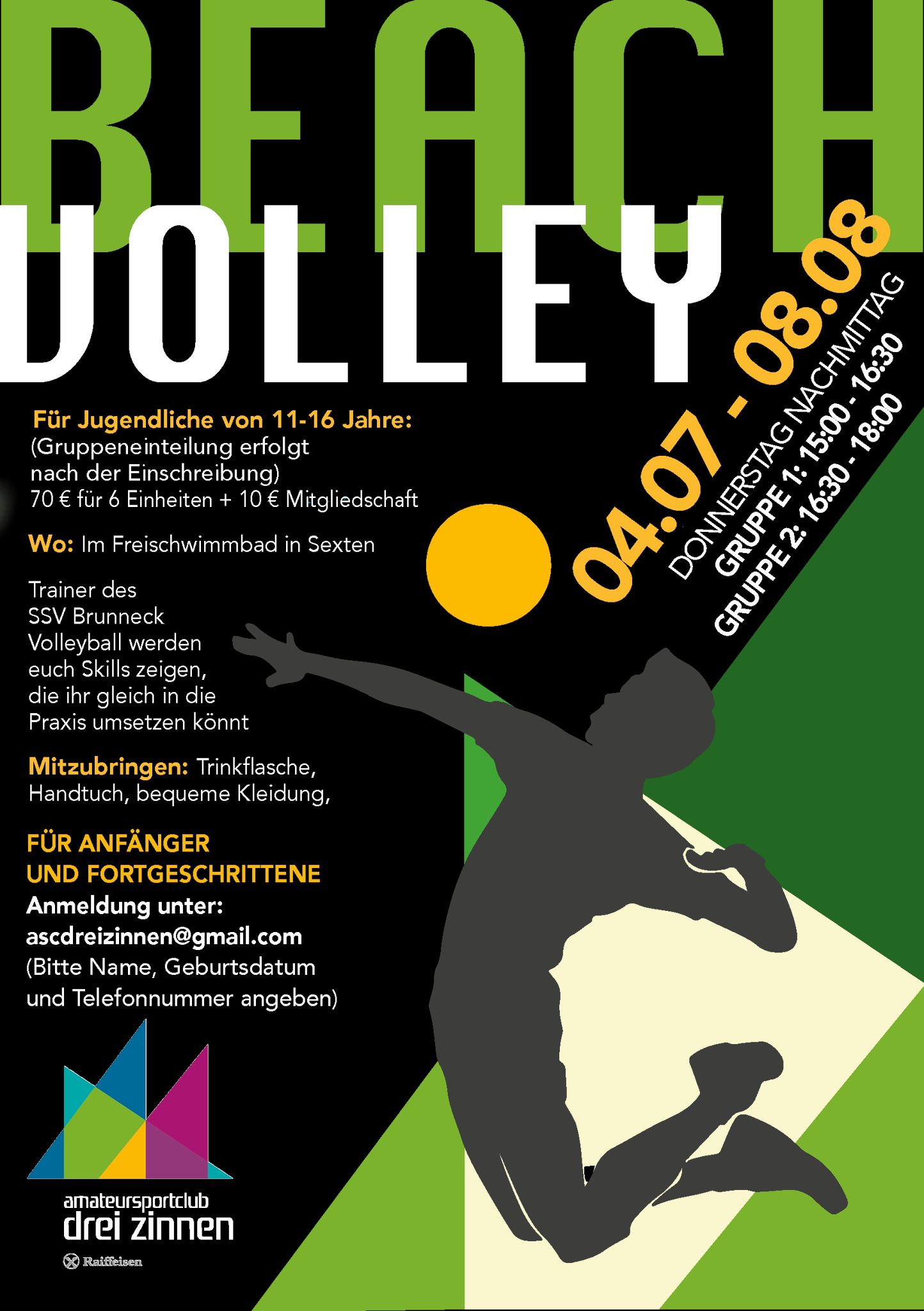 Du wolltest immer schon Volleyball spielen lernen oder möchtest deine Techniken verfeinern? Mit den Trainern des SSV Bruneck hast du die Möglichkeit, einmal wöchentlich die Grundlagen des Volleyballs zu trainieren, dich sportlich zu betätigen, viel Neues zu lernen und eine tolle Zeit in der Gruppe zu verbringen. Sowohl für Anfänger als auch für Fortgeschrittene.. also nichts wie los - melde dich bei unserem Volleyballkurs an!